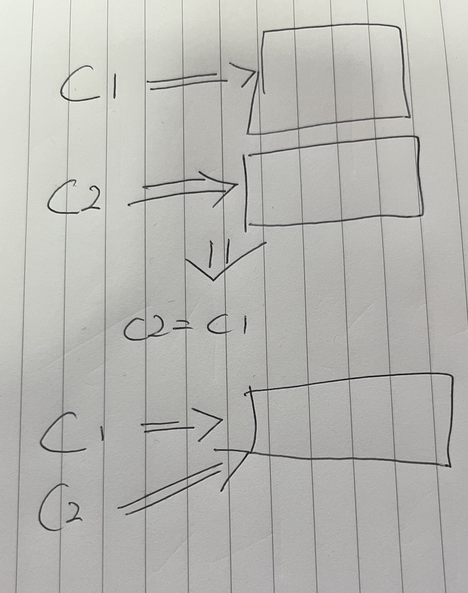 c2 = c1 이라고 하면 c2는 잡고있던 풍선을 놓아버리고 c1이 잡고있는 풍선을 같이 잡아버린다.