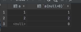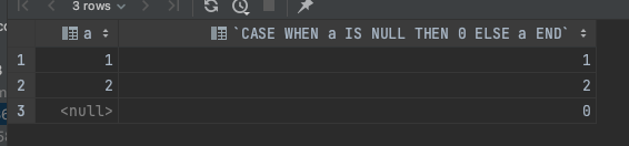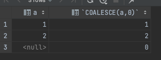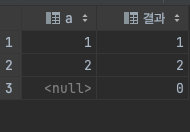 그 결과로 1과 2는 그대로 1과 2를 뱉어냈지만 NULL값 같은 경우는 조건식이 '참'이 되어 0이라는 값을 뱉어낸다.