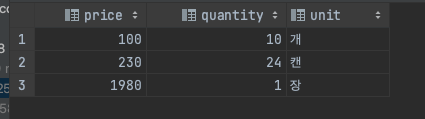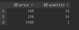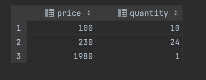 현재 테이블에서는 price가 가격을, quatity가 수량을 의미하고 있다.