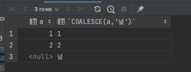 a열에 1과 2는 NULL이 아니라서 1과 2를 그대로 뽑아냈지만 3행에 있는 NULL은 '널'이라는 조건에 걸려서 널 이라고 나오게 된 것이다.