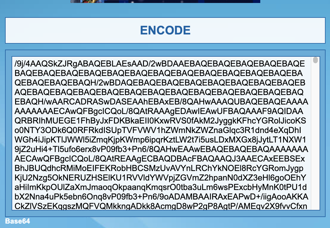 만약에 이런 이미지를 Base64 인코딩을 하면 위와같이 A~Z , a~z, 0~9, + / 안에서 해결한다
