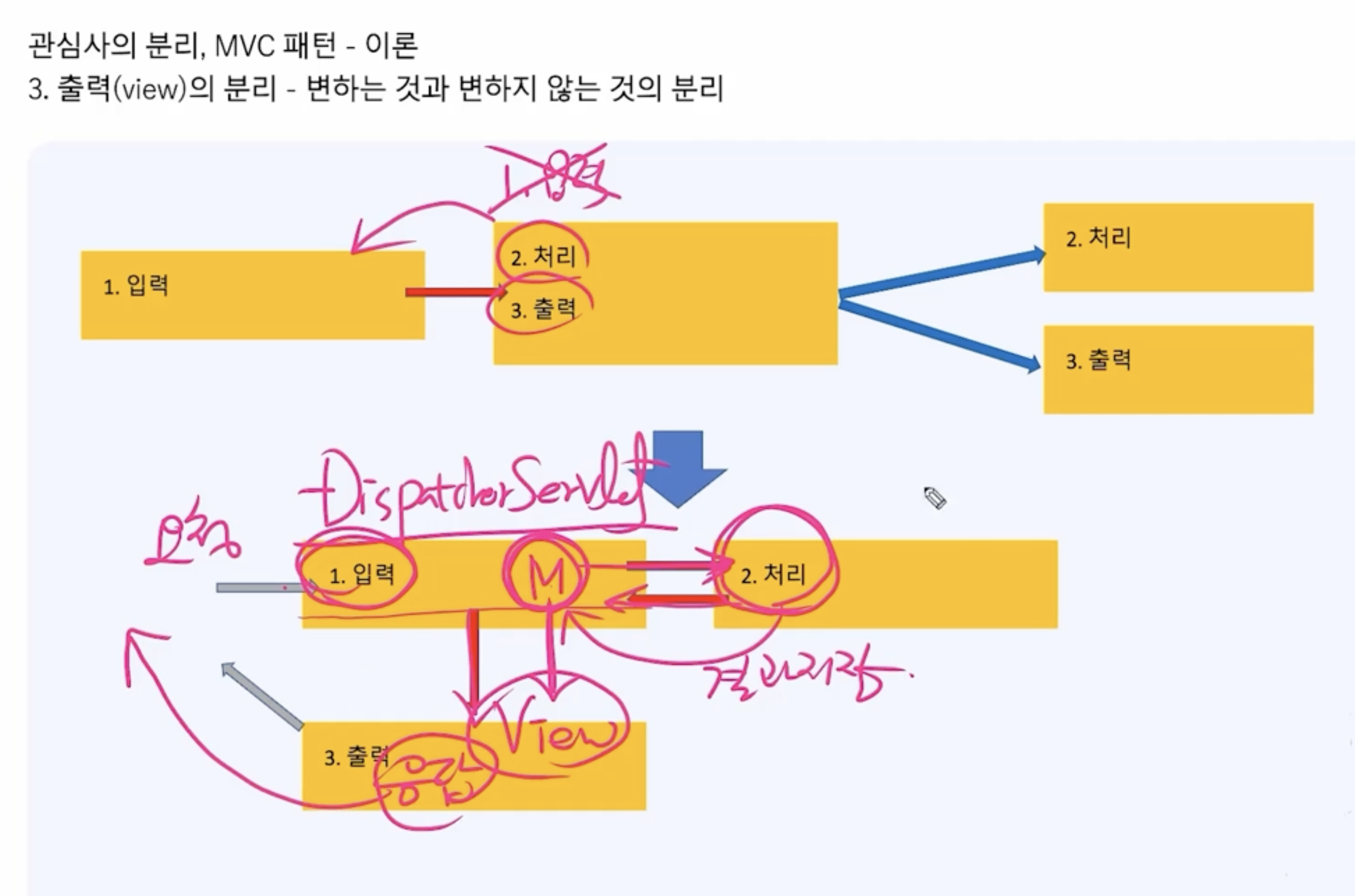 위 이미지를 보면 상단에 방식이 기존의 방식이고 아래에 방식이 MVC패턴이다
