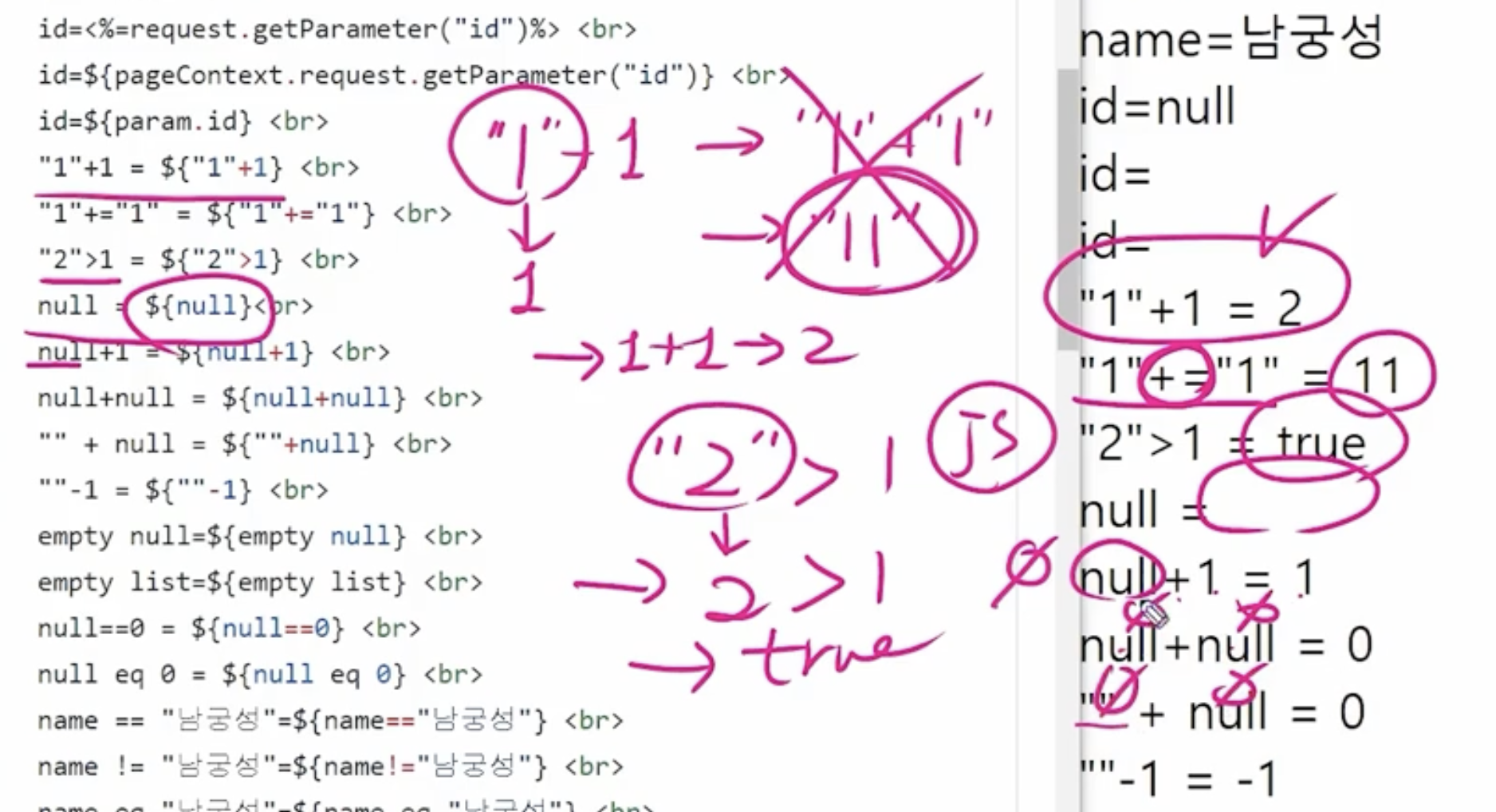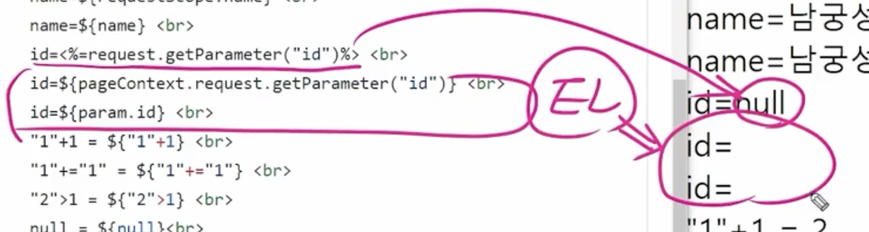 위 그림을 보면 jsp같은 경우는 파라미터를 안주면 null이 나오는 반면