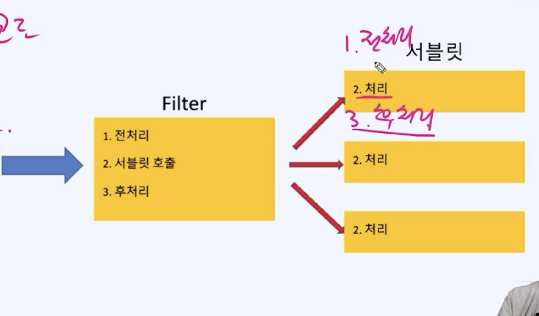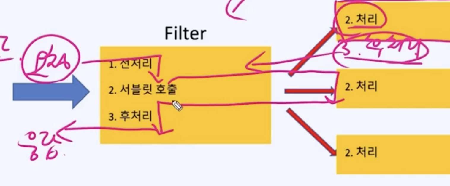 요청이 오면 필터에서 전처리 하고 해당 서블릿을 호출하고