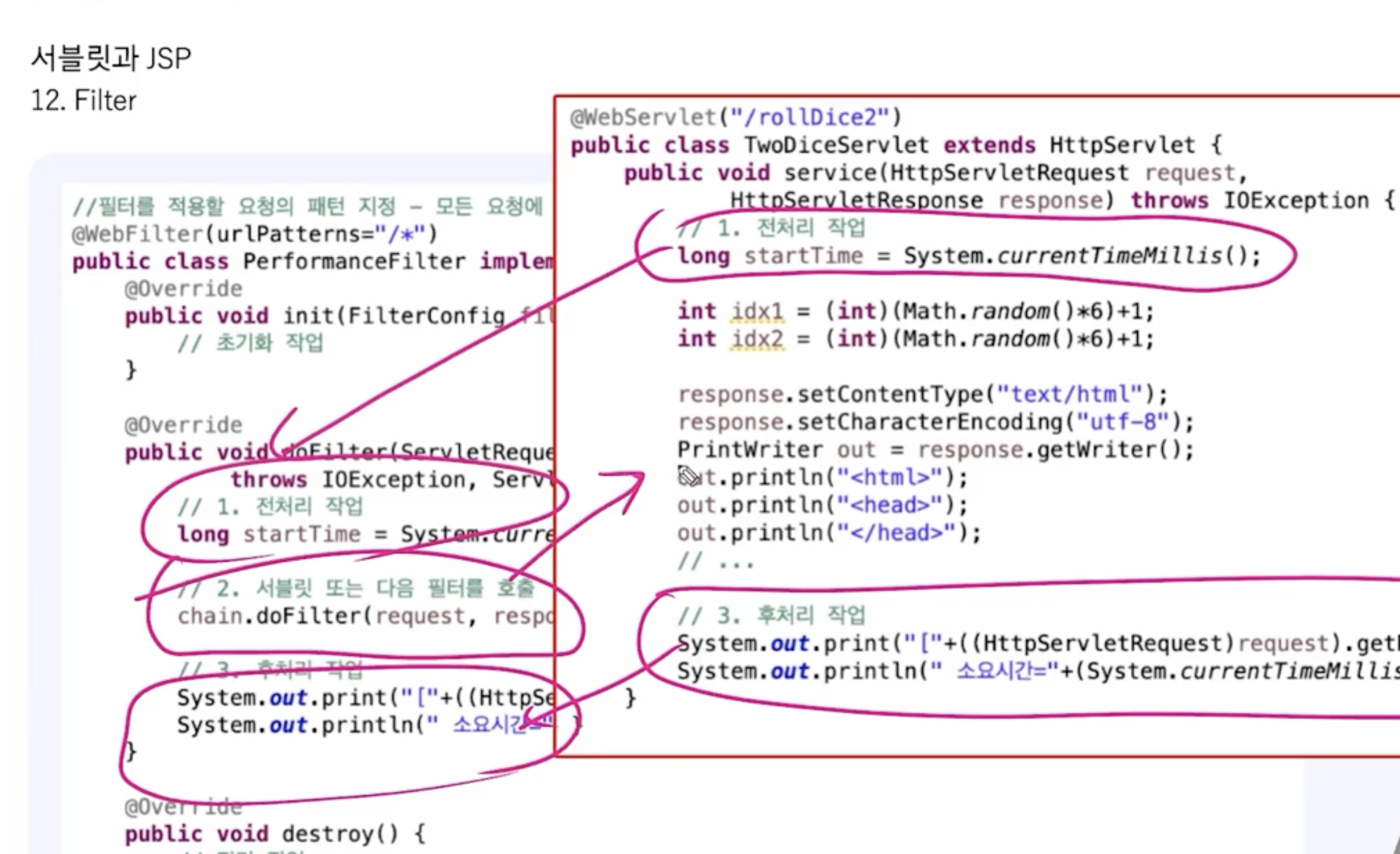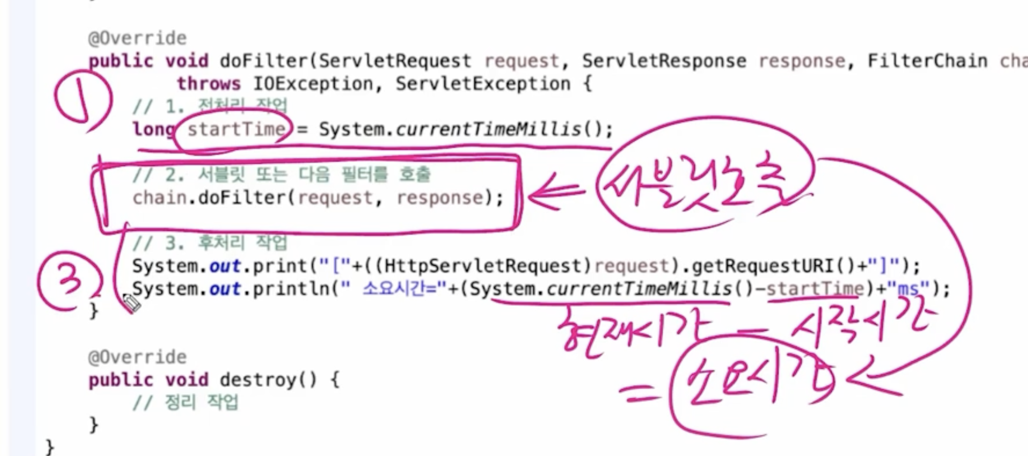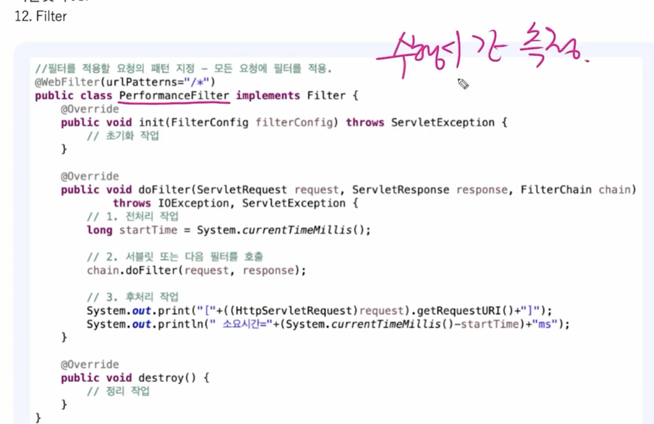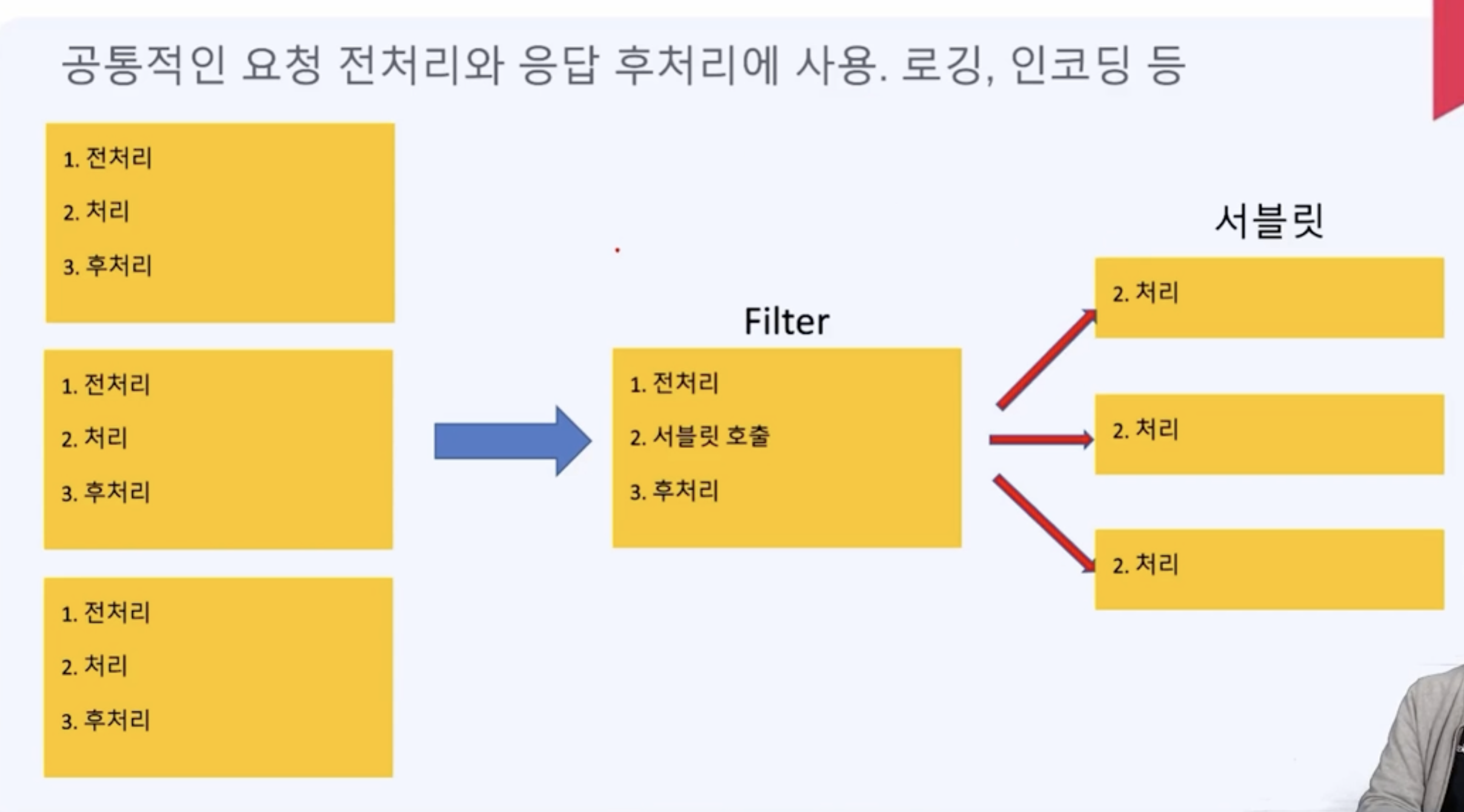 서블릿들이 있을 때 서블릿이 시작하기전에 전처리 그리고 후처리가 있는데