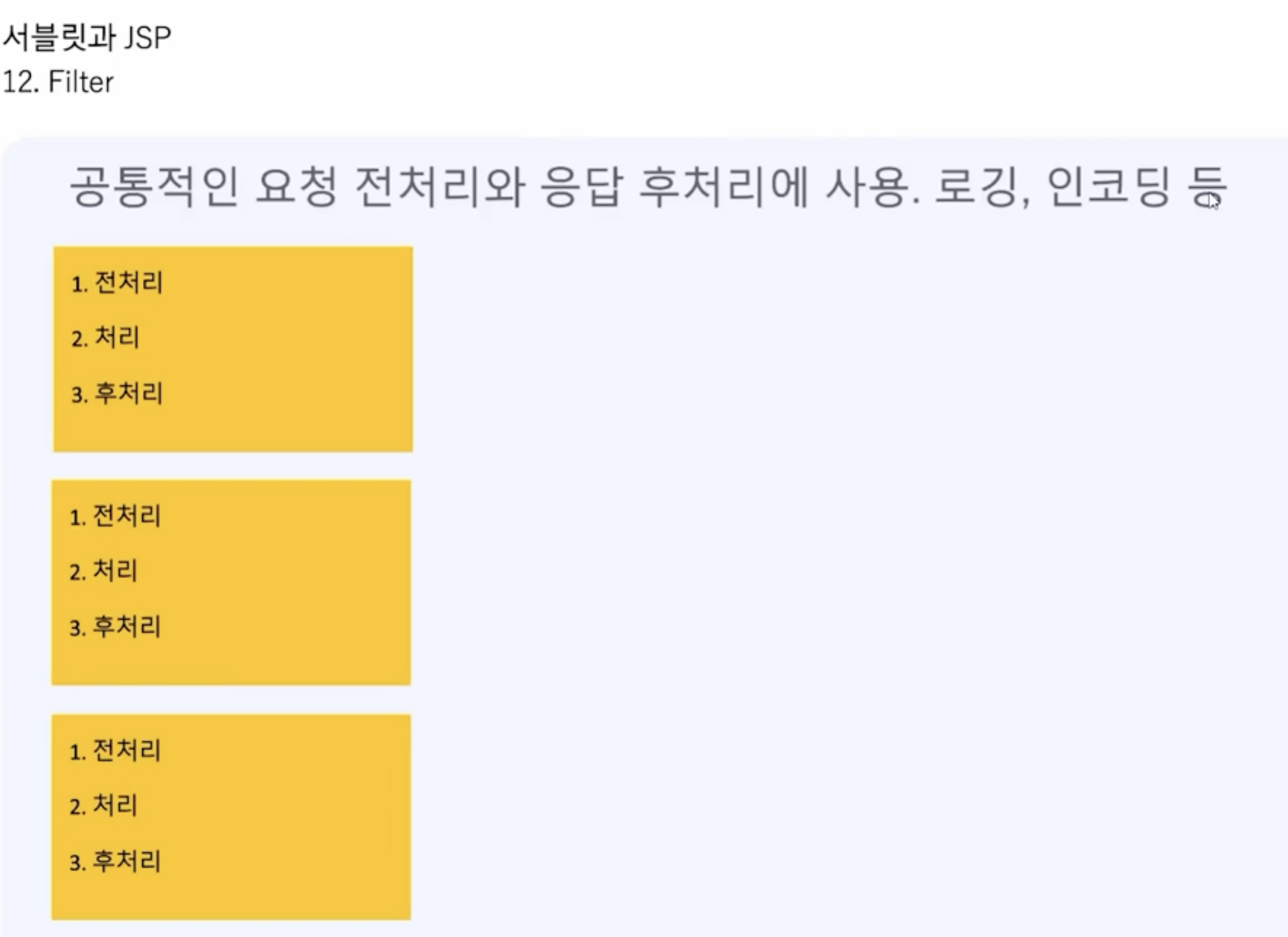 필터를 이용해서 전처리 서블릿 호출 후처리를 분리할 수 있다
