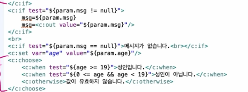 <c:when test="${0 <= age && age < 19}">성인이 아닙니다.</c:when>