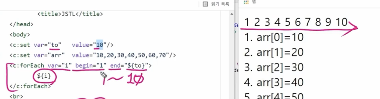 items="${arr}" 이곳에담겨있는 {10, 20 , 30 ... 70} 값들을