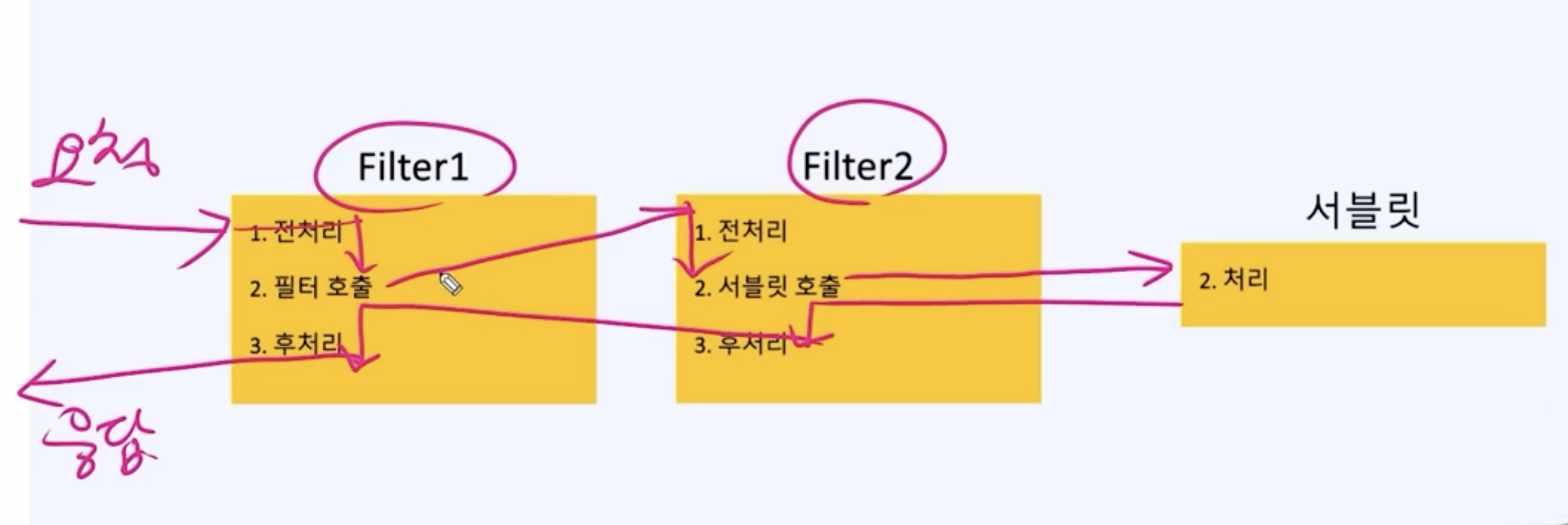 해당 서블릿에서 처리하고 필터에서 받아서 후처리를 하고 응답을 하게 된다