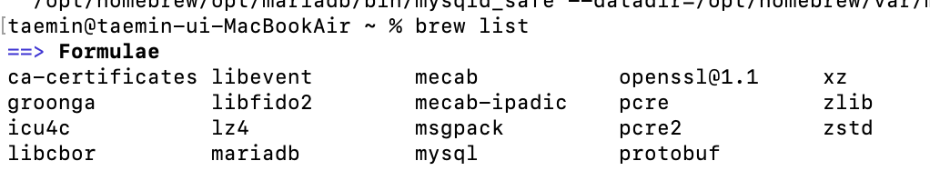 설치가 끝나면 터미널 창에 brew list라고 입력해보자