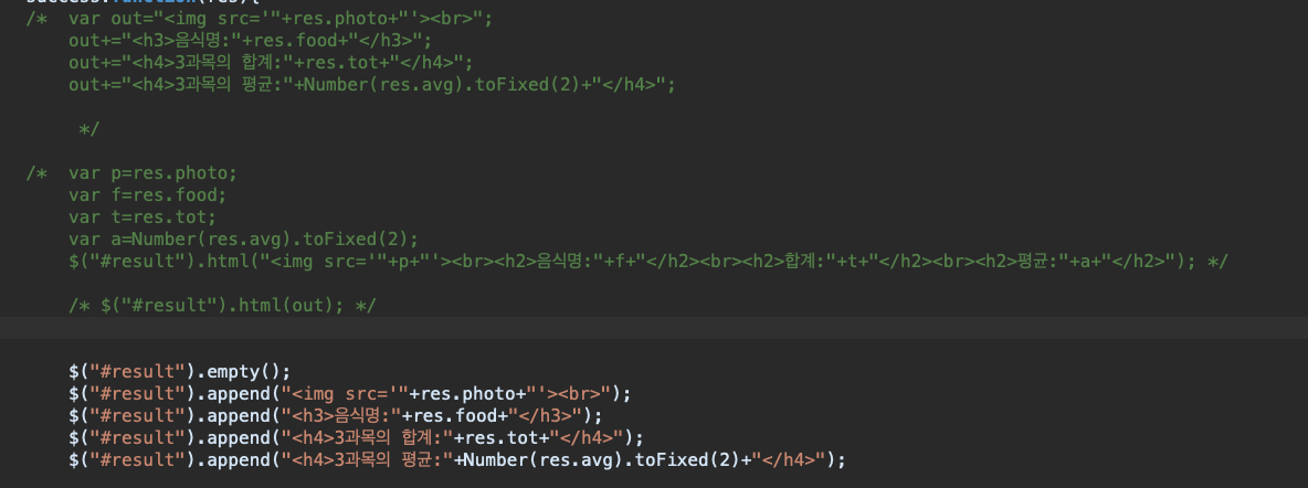 $("#result").html("<img src='"+p+"'><br><h2>음식명:"+f+"</h2><br><h2>합계:"+t+"</h2><br><h2>평균:"+a+"</h2>"); */